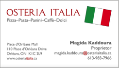 Osteria Italia, right here in Place d'Orléans Shopping Centre, is your locally owned, independent source for fresh and lovingly prepared Italian food. From Espresso to Pizzas and Panini, we have personally, together with internationally renowned chef David Adjey, created a menu that is delicious, fresh, and innovative. For the first time, delicious modern and traditional Italian food is available in the local mall.