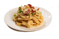 Our in-house rich Fettuccine Alfredo Sauce, with oven roasted Italian pancetta on the side.
