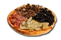 4 seasons pizza with generous portions of olives, artichokes, mushrooms, and pancetta.
