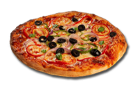 Red onions, red and green peppers, green and black olives, tomatoes and Mozzarella in our red sauce.